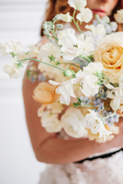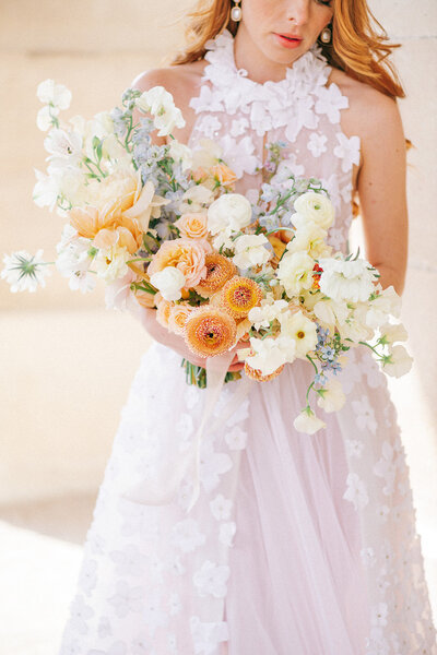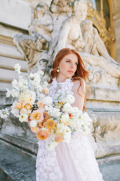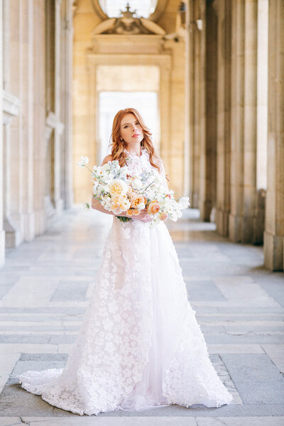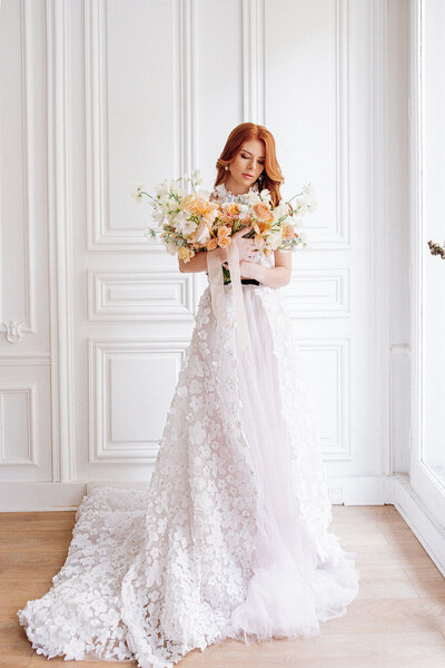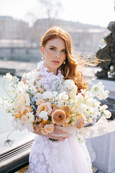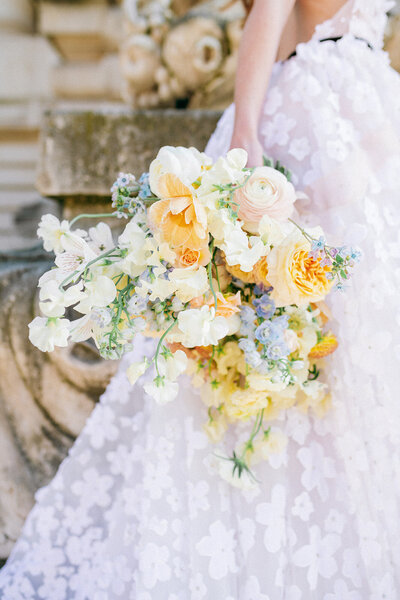 Notre ravissante mariée portait une robe majestueuse, parée de mille pétales, dessinant une silhouette gracieuse, toute en féminité. Son bouquet incroyable complète le look tout en délicatesse avec une palette de couleur qui évoque la floraison printanière et la douceur de vivre.